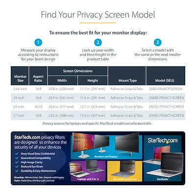 The StarTech.com -PRIVACY-SCREEN is a high-quality privacy filter for 24-inch widescreen monitors with a 16:10 aspect ratio. Its reversible gold and black filter uses Microlouver technology to restrict viewing angles beyond ±30°, helping protect sensitive on-screen data in offices, public spaces, or shared environments.