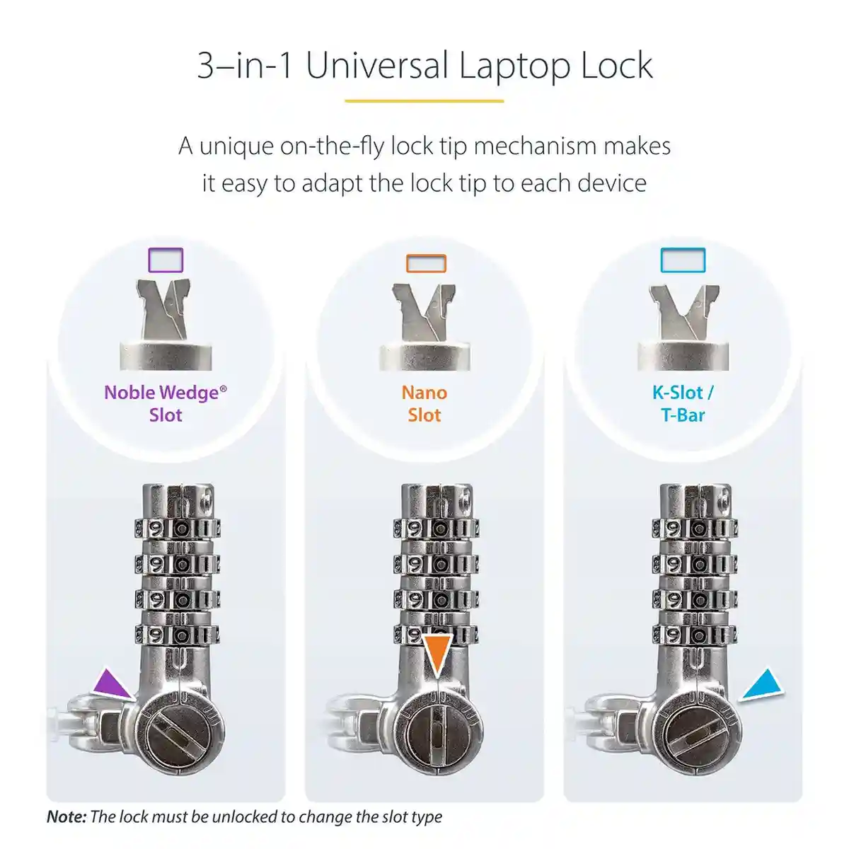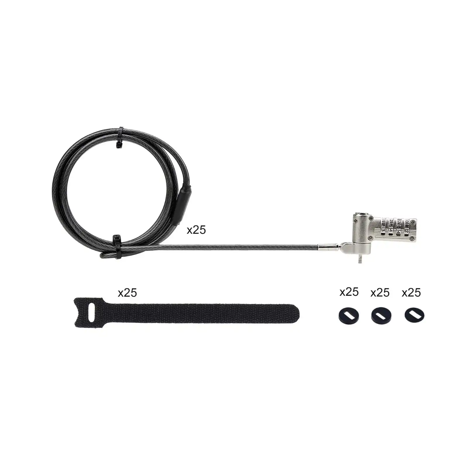- 25-PACK UNIVERSAL 3-IN-1 LAPTOP LOCK: Compatible with Noble Wedge®, K-Slot (T-Bar), and Nano lock slots using an adjustable lock tip; 6.6ft (2m) and 0.17in (4.4mm) thick cut-resistant carbon steel cable; Lock can withstand a pull force of up to 202lb