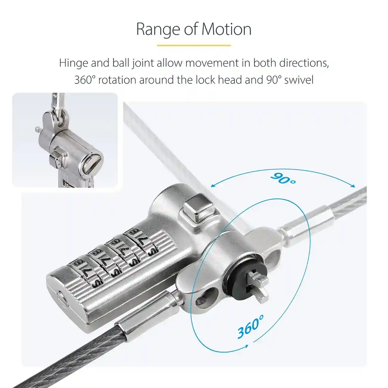 The diameter of the lock head is 0.4in (14mm) and features a ball joint design that allows for 360° rotation and 90° pivot of the lock head. This flexibility reduces coiling and minimizes strain on the notebook slot, enhancing durability and usability.