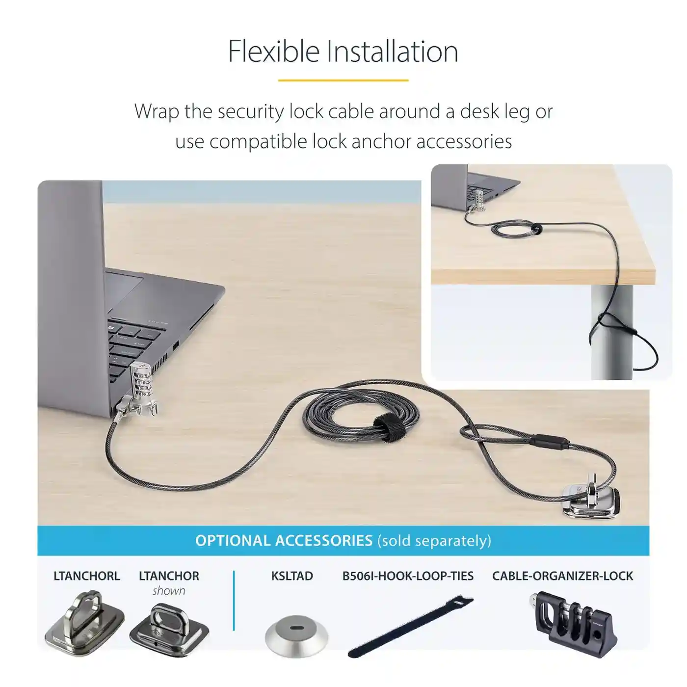- FLEXIBLE INSTALLATION: Included hook & loop strap keeps portable notebook cable lock organized.