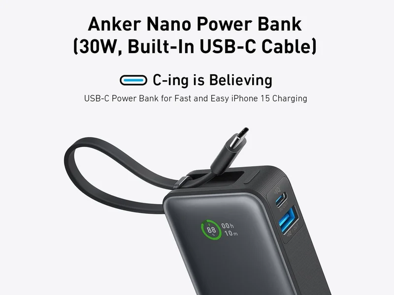 The Anker Nano 10K 30 W Power Bank (A1259H11) is a sleek, pocket-sized charger with a 10,000mAh capacity and a built-in USB-C cable that doubles as a lanyard. It supports 30 W two-way charging — so you can quickly recharge both your device and the power bank itself. An integrated color display shows charge status, and the case uses 80% post-consumer recycled plastic for eco-conscious design.