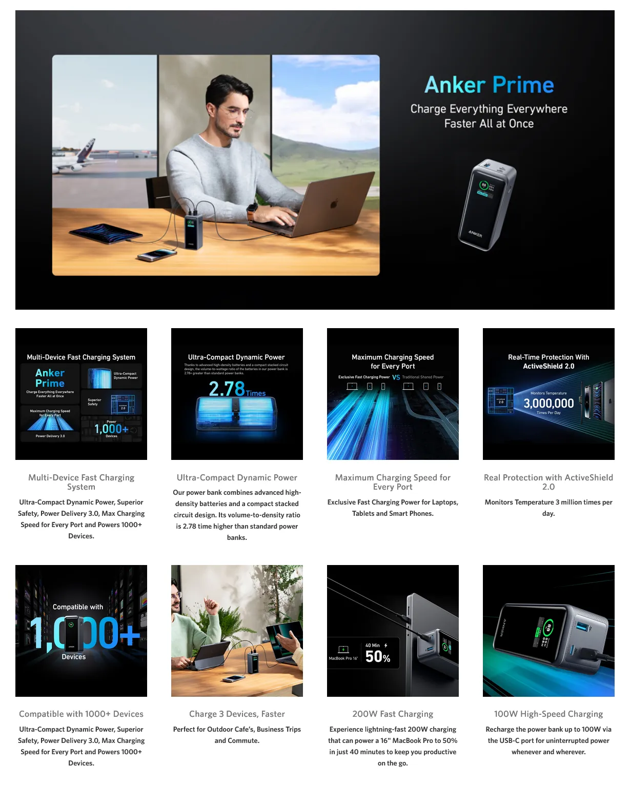 The Anker Prime 20K 200W Power Bank (A1336011) is a powerhouse portable charger engineered for professionals, travellers, and power users who demand maximum speed and reliability. With an impressive 20,000mAh capacity and a total output of 200W, this premium power bank delivers exceptional charging performance for laptops, tablets, phones, gaming consoles, and all USB-C devices. Equipped with dual USB-C ports and one USB-A port.