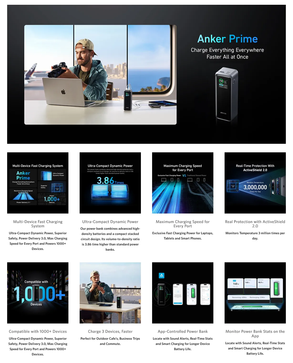 The Anker Prime 27K 250W PD 3.1 Power Bank (A1340011) is one of Anker’s most advanced high-output portable chargers, delivering professional-grade performance for laptops, tablets, smartphones, gaming devices, and more. Featuring an enormous 27,000mAh capacity and a combined 250W power output, Equipped with dual USB-C ports.