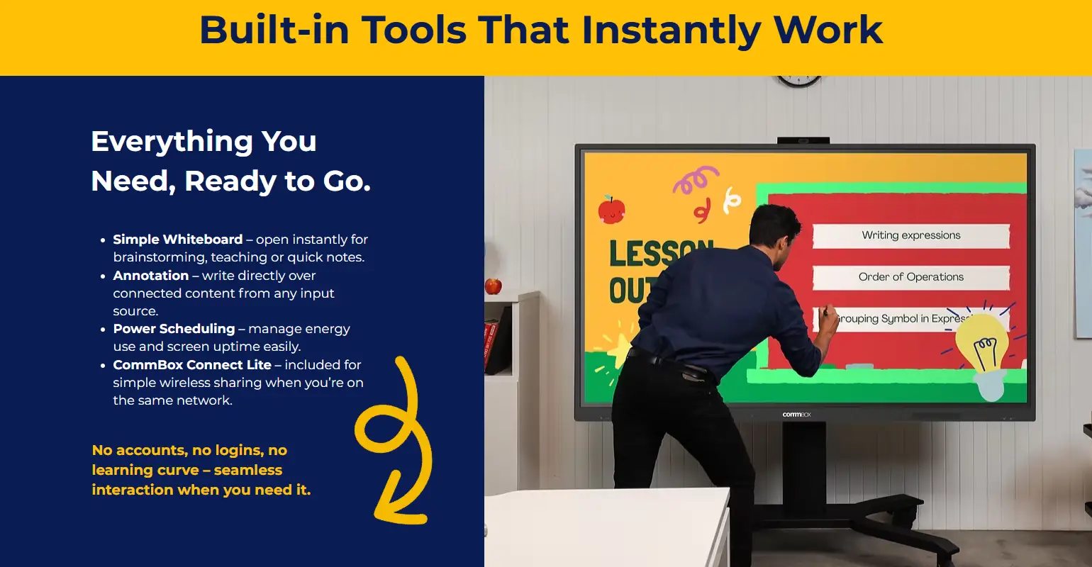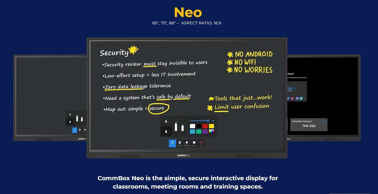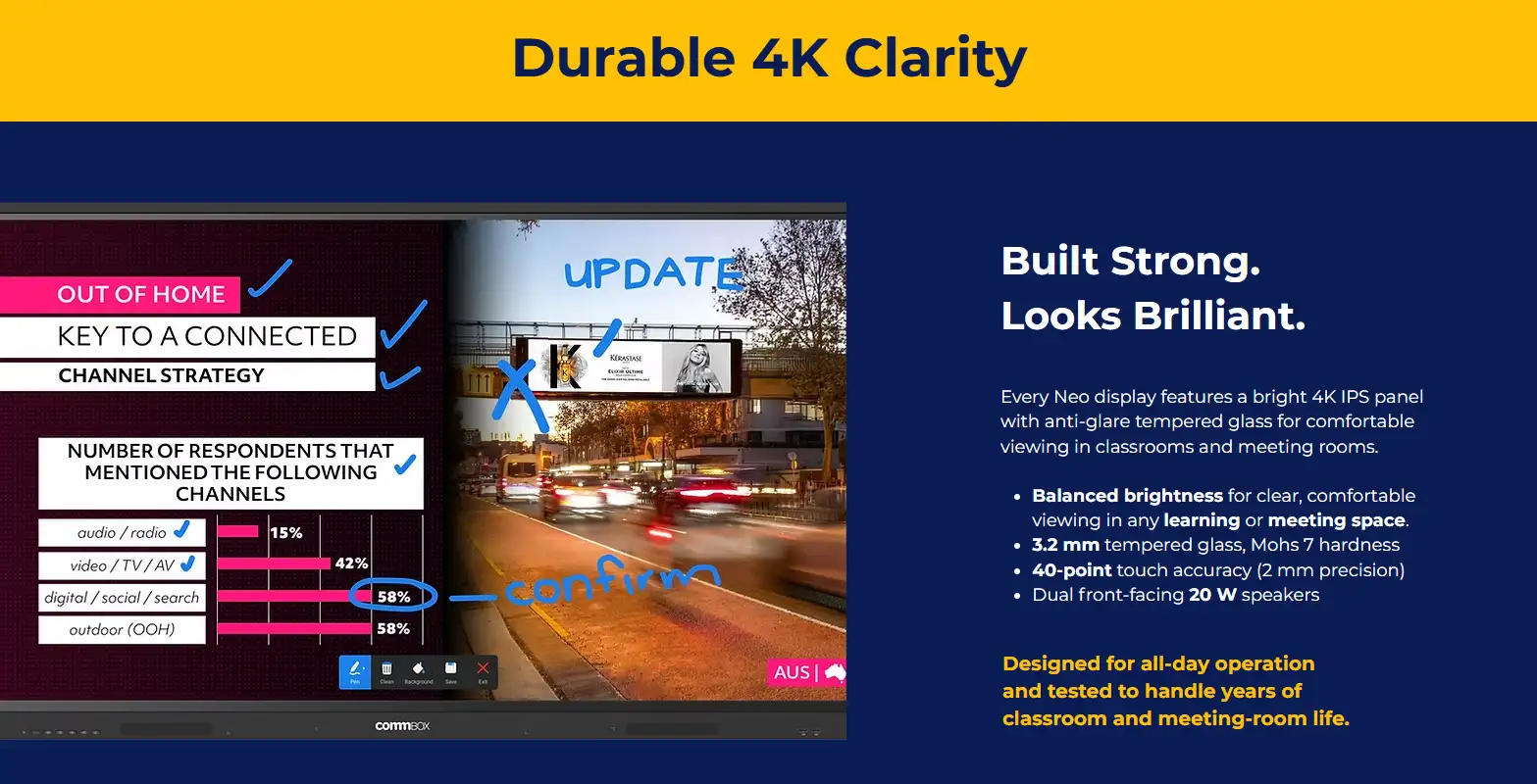 CommBox 75-inch 4K UHD Interactive Touch Display with Android 13, 40-point multi-touch, 8GB RAM, and 64GB storage. Perfect for classrooms, meeting rooms, and collaborative presentations, 5year warranty.