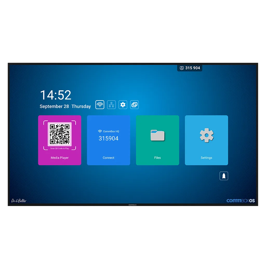 The CommBox 75-inch 4K UHD Interactive Touch Display is an advanced collaboration solution designed to enhance communication, teaching, and teamwork. Featuring a large 75-inch IPS display with 3840 × 2160 Ultra HD resolution, it provides crystal-clear visuals, vibrant colours, and wide viewing angles for engaging presentations and interactive learning.