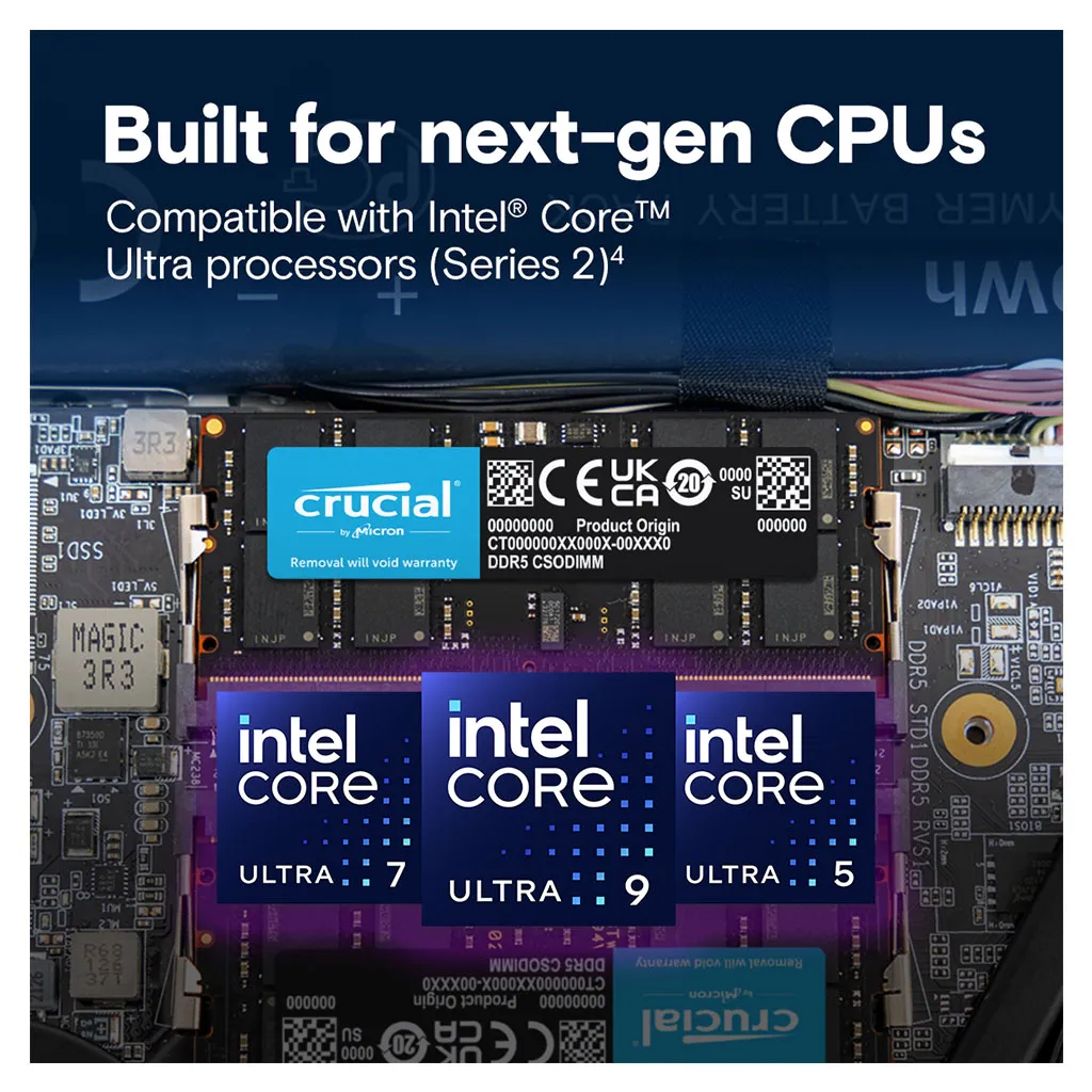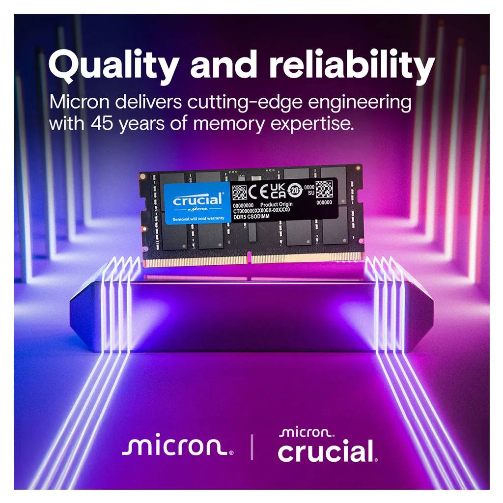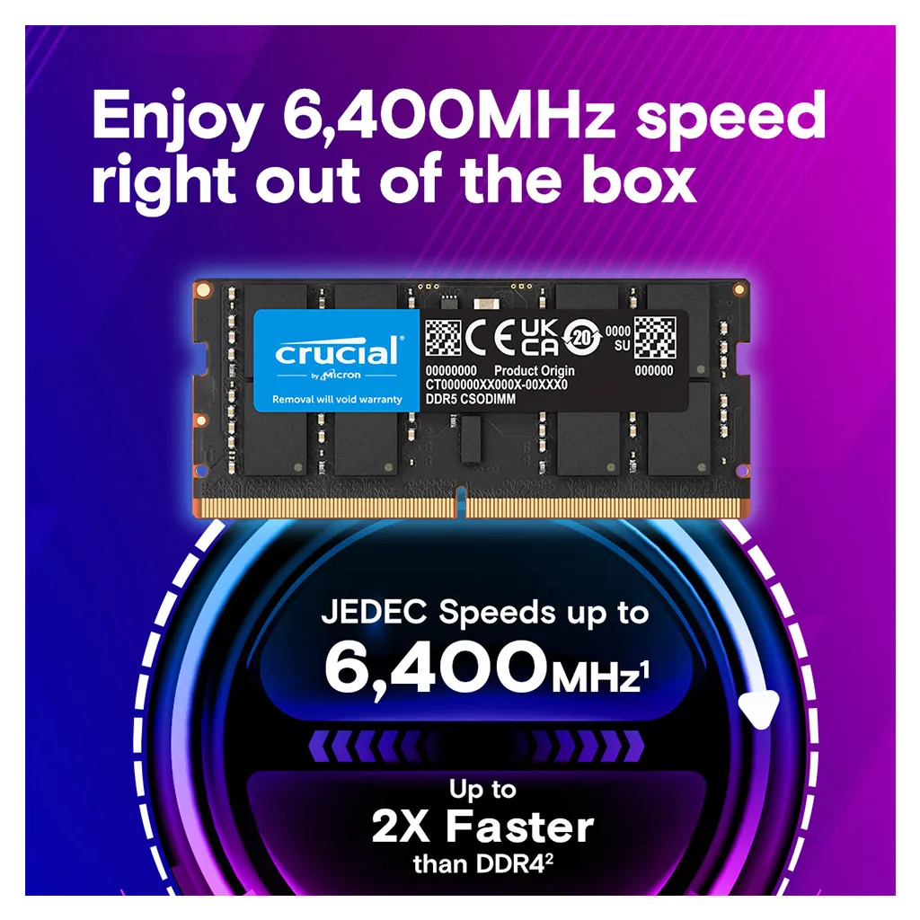 Crucial 32 GB DDR5-6400 (CT32G64C52CS5) CSODIMM delivers 6,400 MT/s speed, 1.1 V efficiency, CL52-52-52 latency, on-die ECC, and a limited lifetime Crucial warranty — ideal for next-gen laptops.