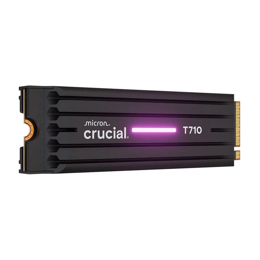 Crucial T710 1 TB PCIe 5.0 NVMe SSD (CT1000T710SSD5) delivers up to 14,900 MB/s read, 13,700 MB/s write, 1.8 M/2.2 M IOPS, 600 TBW endurance, integrated heatsink, and a 5-year warranty.