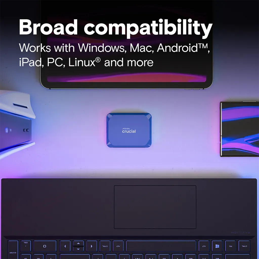 The Crucial X10 2TB Portable SSD (CT2000X10SSD9) provides lightning-fast external storage with a sleek and rugged design. It uses a USB 3.2 Gen-2×2 (20 Gb/s) interface to deliver sequential read speeds of up to 2,100 MB/s, enabling fast backups, large file transfers, and even direct video editing. Engineered by Micron, this drive is built to last, featuring IP65-rated dust and water resistance and drop protection up to 3 meters (9.8 ft). The compact, pocket-sized design makes it highly portable, and it’s bus-powered via USB-C, so you don’t need an external power source. It works with a wide range of devices — Windows, macOS, Linux, Android, iPad, and gaming consoles. A USB-C to USB-C cable comes in the box, and the drive is backed by a 3-year limited warranty.