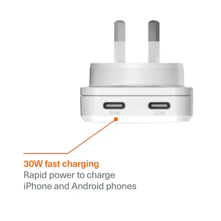 Cygnett ChargePlus 30W Dual Port GaN Slim Wall Charger – White delivers efficient fast charging with dual USB‑C ports and GaN technology, up to 30 W total output, slim design and global 100–240 V compatibility — perfect for phones and tablets, 2 year warranty.