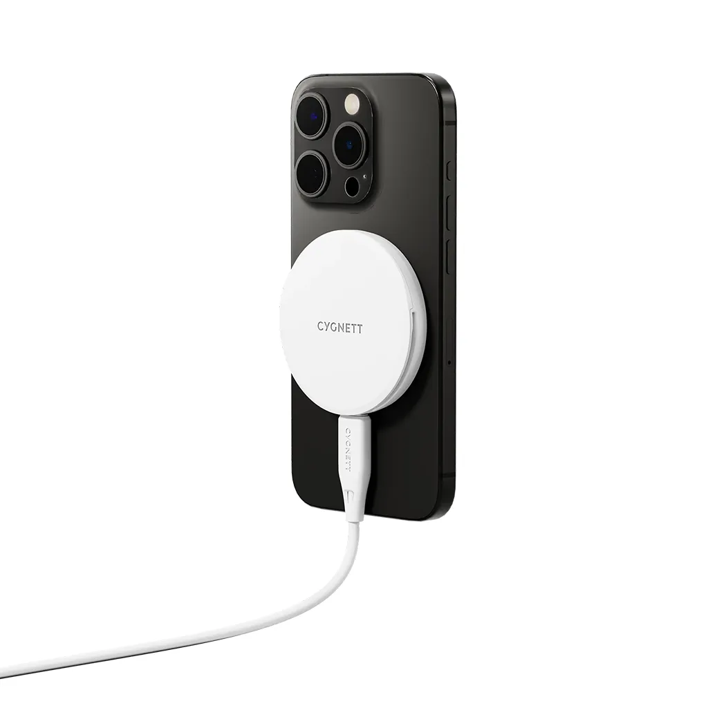 Cygnett ChargePuck Qi2 15W Fast Wireless Charger – White offers fast Qi2 magnetic wireless charging with up to 15 W output, built-in magnetic alignment, USB-C cable included, compact design, and a 2-year warranty.