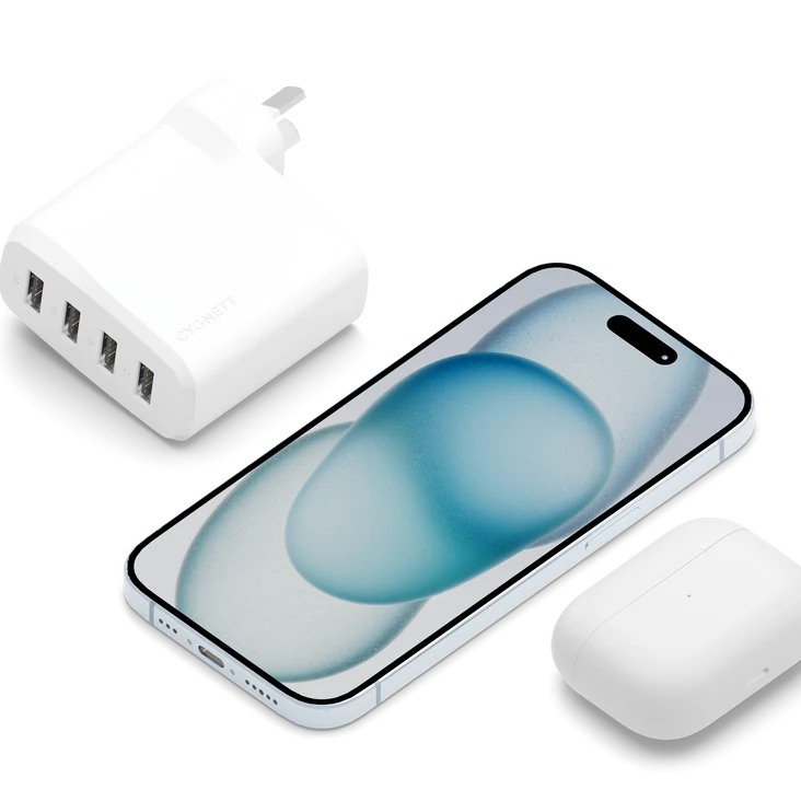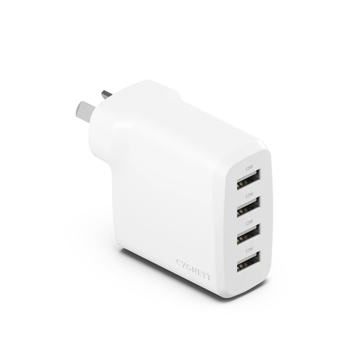 Cygnett PowerPlus 24W Multi-Port USB-A Wall Charger, 4-port USB-A charger with 24 W output, compact design, and 2-year warranty. Charge multiple devices simultaneously.