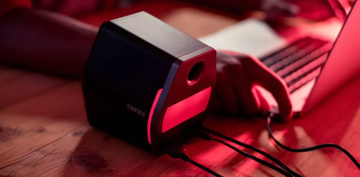 Edifier compact Gaming Speakers with 16 W output, Bluetooth 4.2, front bass units, mechanical volume control, and bold red design for desktop setups.