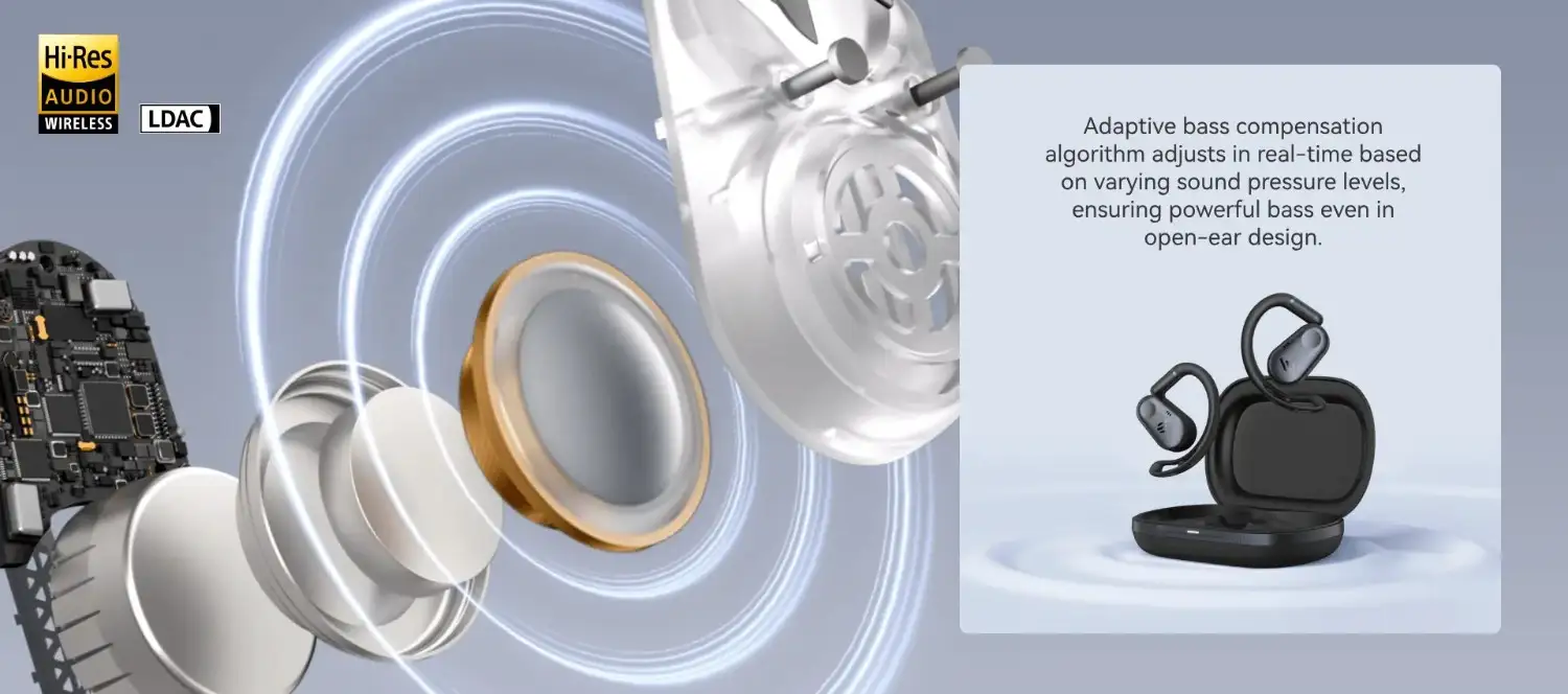 Directional acoustic technology minimizes sound leakage in the open-ear design, ensuring clear and private listening.
