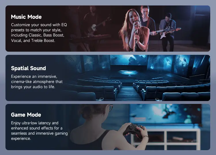 It offers three sound modes, delivering a personalized audio experience tailored to every entertainment setting.