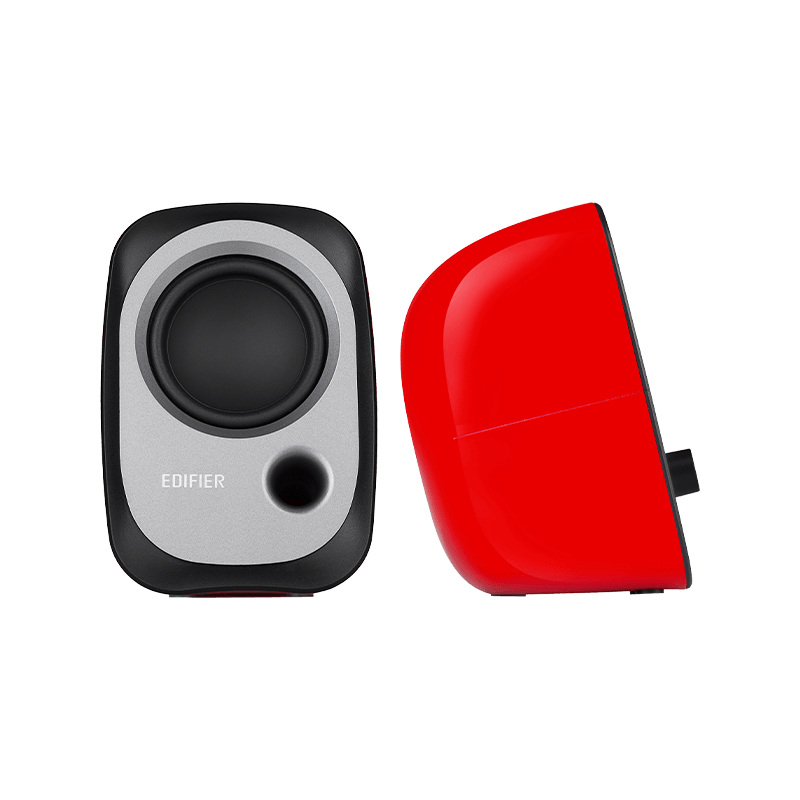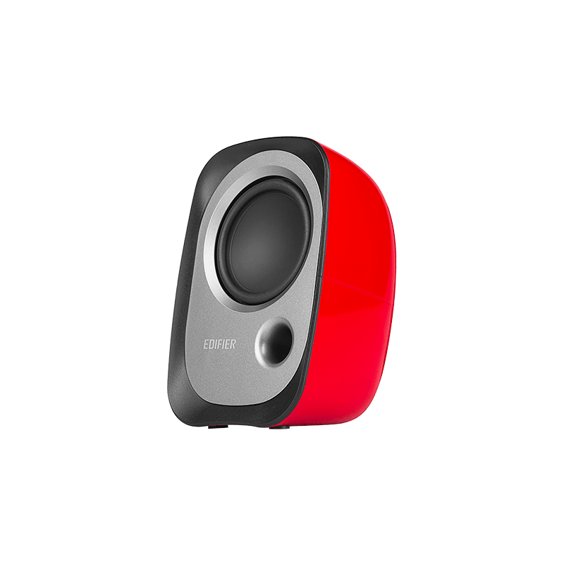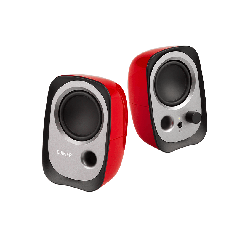 Edifier R12U-RED USB powered multimedia speakers featuring dual full-range drivers, front bass reflex port, AUX input, and headphone output. Compact 2.0 desktop speakers for clear everyday audio.