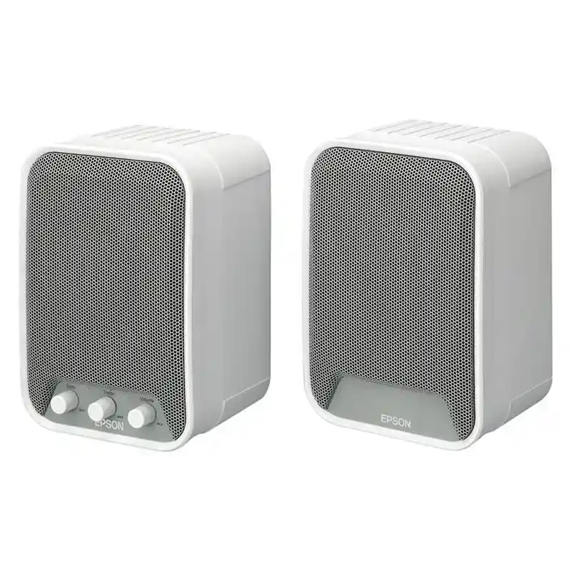 Epson ELP-SP02 Active Speakers deliver 30W Stereo Sound with 2×15W Output, wall-mountable design, RCA and 3.5 mm inputs, and built-in amplifier for Epson projectors, classrooms, and meeting rooms, 1year warranty.