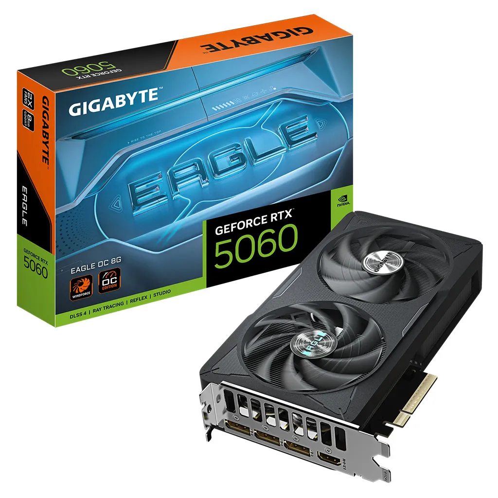 The Gigabyte GeForce RTX 5060 EAGLE OC 8G is a factory-overclocked graphics card designed for smooth 1080p gaming and efficient 1440p performance. Powered by NVIDIA’s Blackwell architecture, it delivers improved power efficiency, advanced ray tracing, and AI-accelerated technologies such as DLSS 4. Featuring Gigabyte’s EAGLE cooling design and 8GB of high-speed GDDR7 memory, this card offers stable performance, controlled thermals, and reliable operation for modern gaming systems.