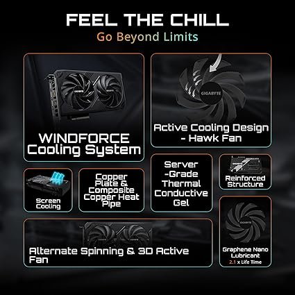• WINDFORCE cooling system includes dual Hawk fans, server‑grade thermal gel, composite copper heat pipes, and copper baseplate for efficient thermal dissipation and quiet operation.