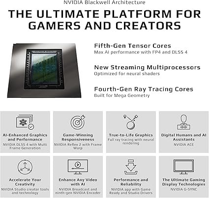 • Full support for DirectX 12 Ultimate, OpenGL 4.6, Vulkan, G‑SYNC, Resizable BAR, and NVIDIA ecosystem software (Broadcast, Studio, RTX Remix, etc.).