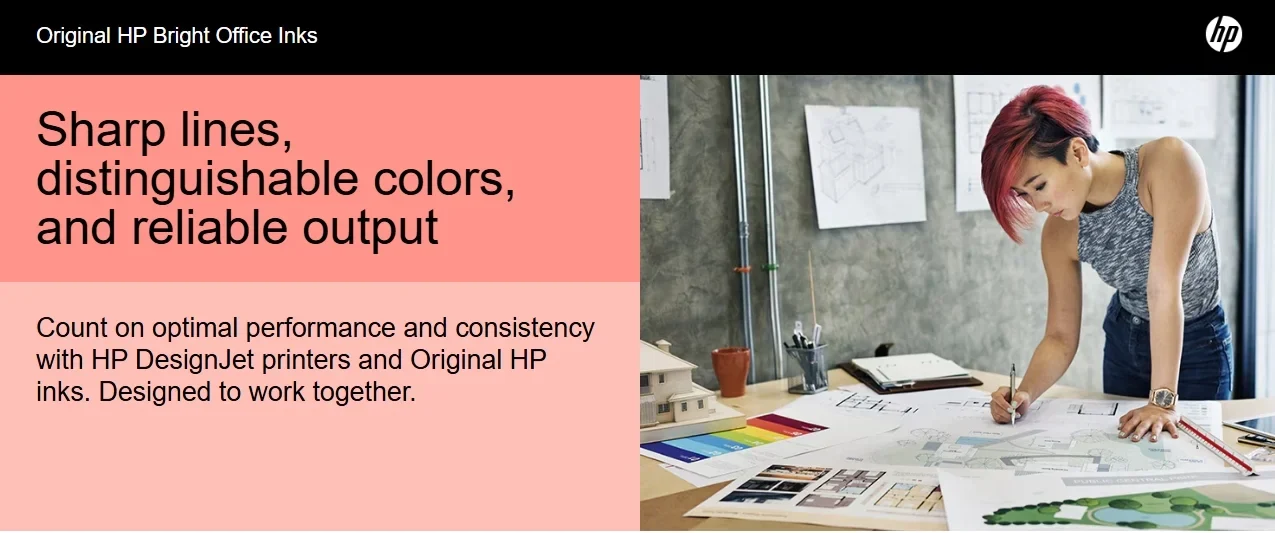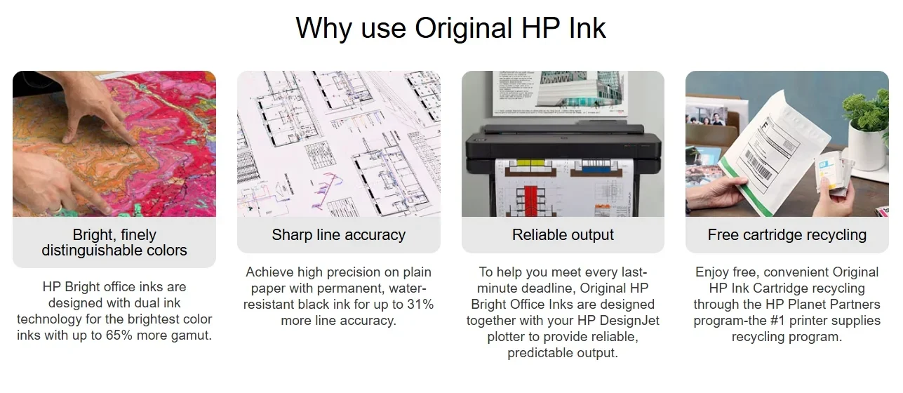 Present your professional best with the accurate, clear prints produced by Original HP inks. Get dark blacks and vivid colors with four Original HP inks and the HP printhead. Avoid waste and rework—Original HP printing materials and inks work together to get the job done right.