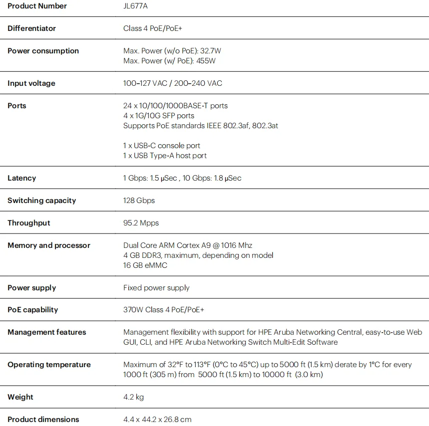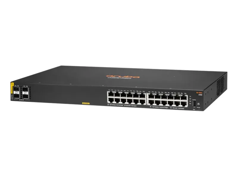 The HPE Aruba 6100 24-Port Class 4 PoE & 4× SFP+ 370 W Network Switch is a managed Layer-2 Gigabit Ethernet access switch delivering 24× PoE+ Gigabit ports and 4× 1 G/10 G SFP+ uplinks with a 370 W Class-4 PoE budget, ideal for powering wireless APs, IP phones, cameras, and other powered devices while supporting flexible high-speed uplinks.
