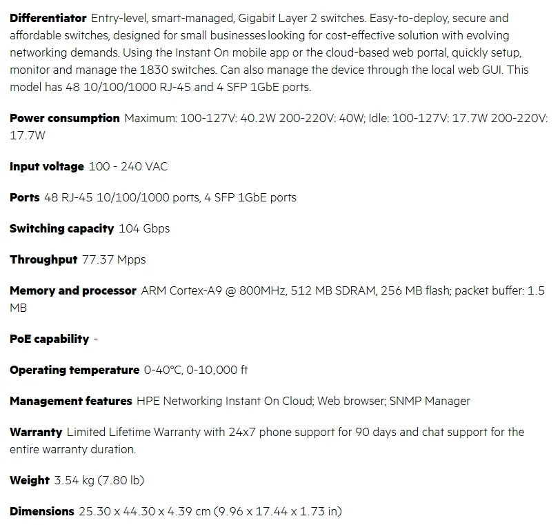 The HPE Aruba Instant On 1830 48-Port 4-Port SFP Switch is a smart-managed Layer 2 Gigabit Ethernet switch designed to scale business wired networks with 48 10/100/1000 Mbps RJ-45 ports plus 4 × 1 Gb SFP uplinks for fibre connectivity