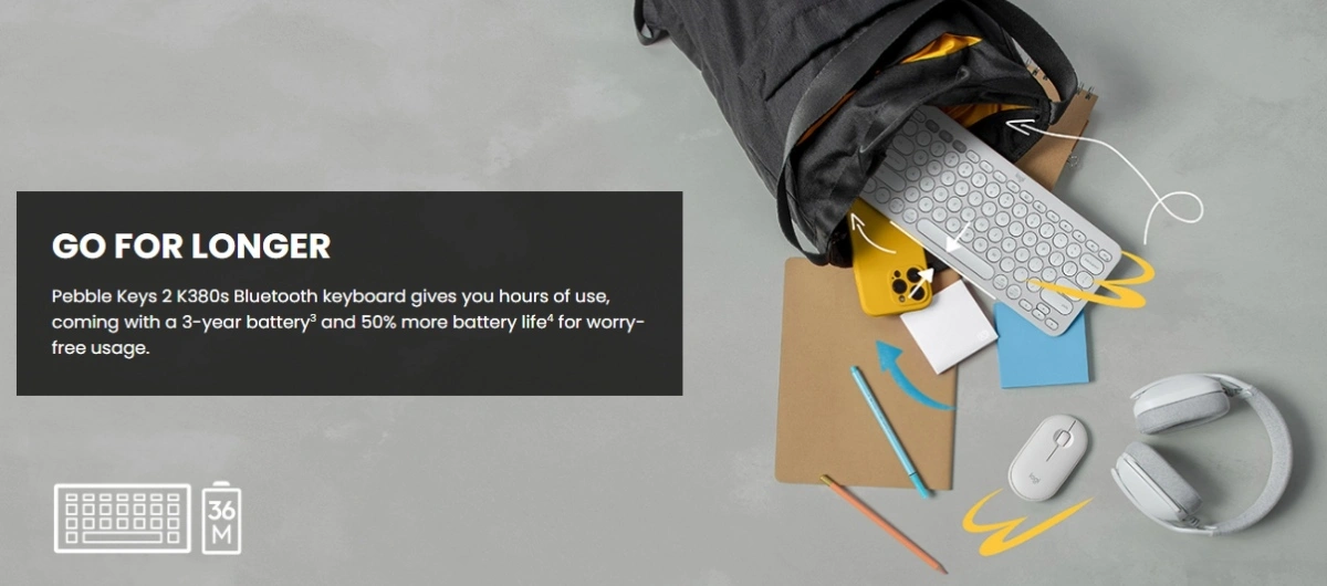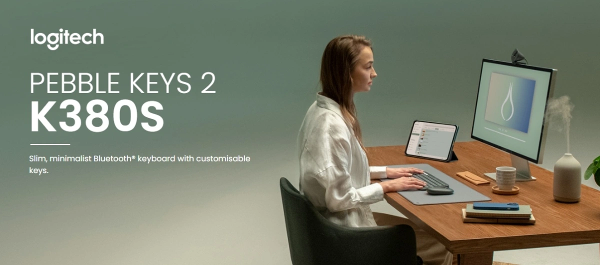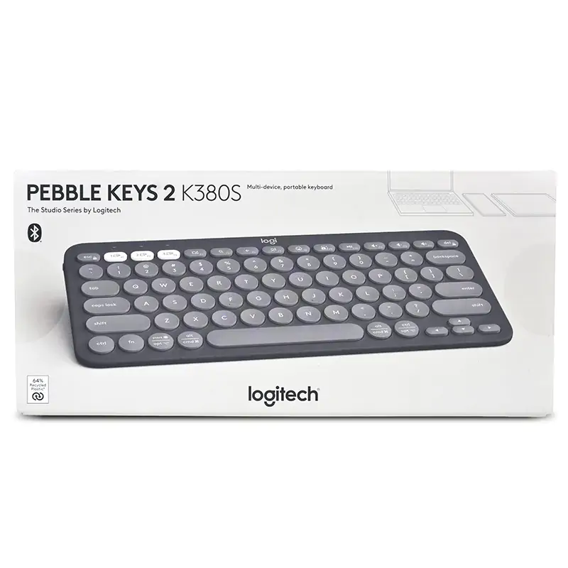 Logitech Pebble Keys 2 K380s Slim wireless Bluetooth keyboard with quiet low-profile keys, multi-device pairing, customizable shortcuts, 36-month battery life, and broad OS compatibility.