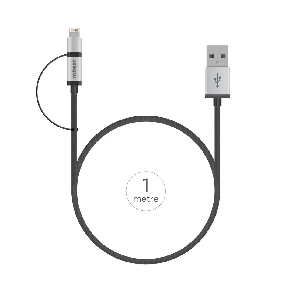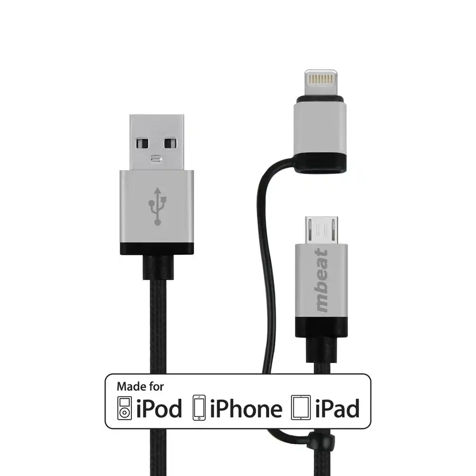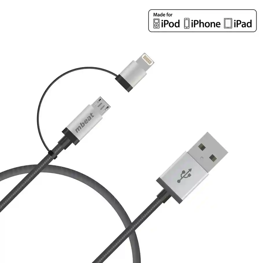 mbeat® 1m Lightning and Micro USB Data Cable – 2-in-1/Aluminmum Shell Crush-Proof/Nylon Braided/Silver/ Apple/Andriod Tablet Mobile Device (LS). The mBeat MB-ICAB21-1S is a professional data cable with USB 2.0 connectors at one end and micro USB with removable lighting adapter at the other end. Perfect for connecting or charging various smartphone or tablet devices. Featuring a black braided cable to help protect against knotting and tangles, while adding extra strength and durability to the cable. Perfect for around the house or office.