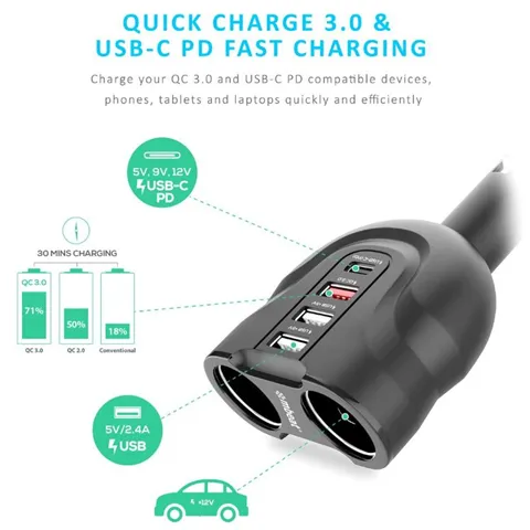 Gorilla Power 4-Port USB-C PD And QC3.0 Car Charger with Cigarette Lighter Splitter-MB-CHGR-C38