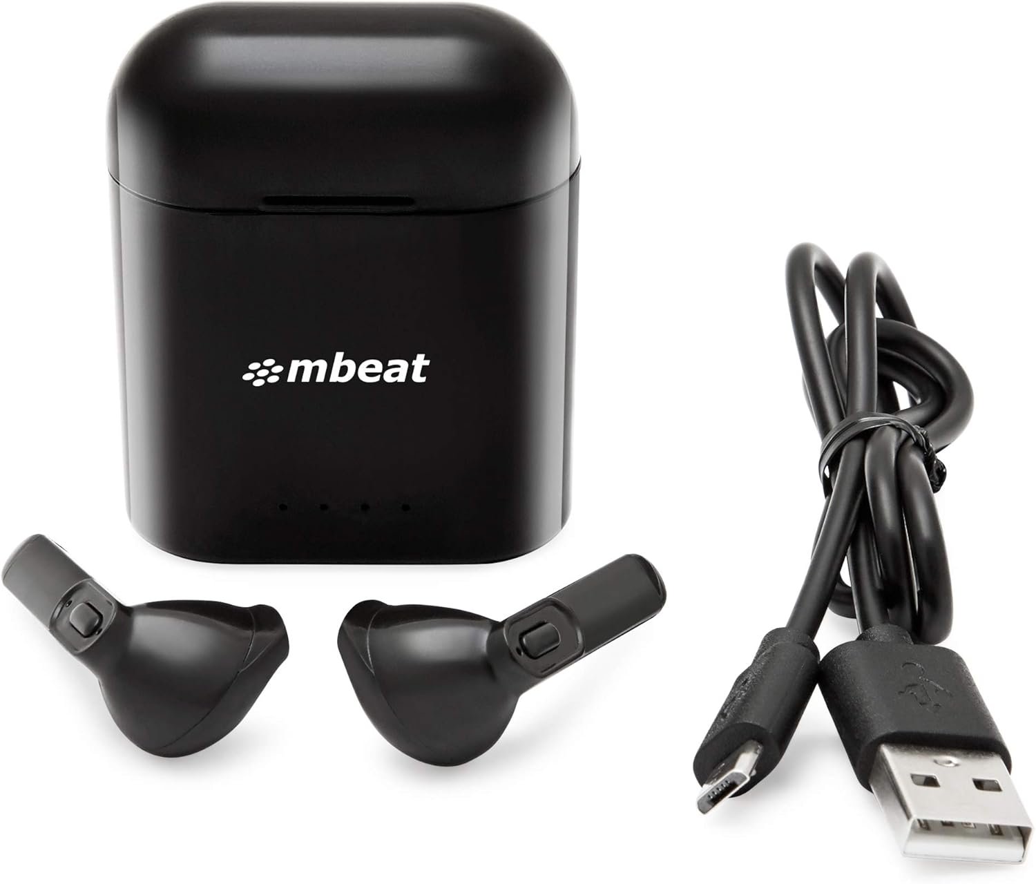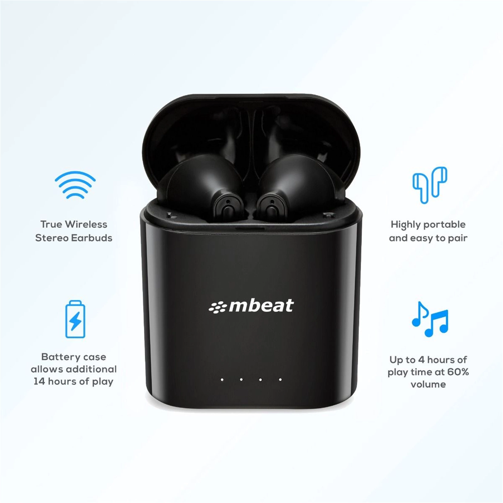 mbeat MB-TWS-E1 true wireless earbuds with Bluetooth 5.0, up to 4 hours playtime on a single charge, 500mAh charging case for up to 18 hours total, and clear audio performance — ideal for everyday Wireless listening.