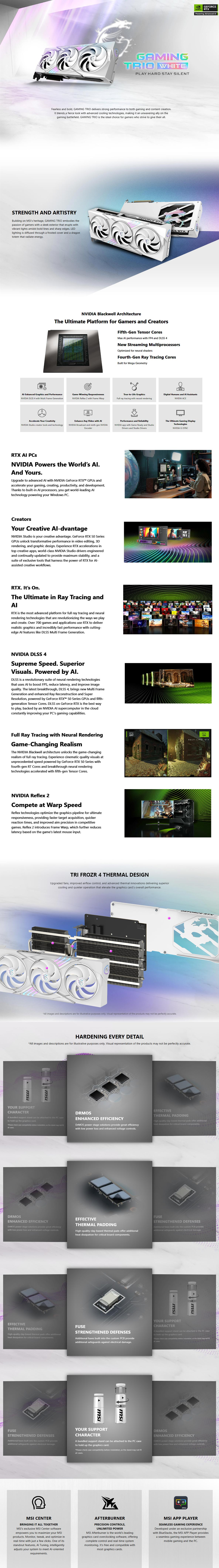 MSI’s TRI FROZR cooling system uses three high-efficiency fans (STORMFORCE / Storm-force fan design), a nickel-plated copper baseplate, optimized heat-pipes (Core Pipes), and a vented metal backplate — ensuring efficient heat dissipation under load while keeping noise and temperatures controlled, even during long gaming or rendering sessions.