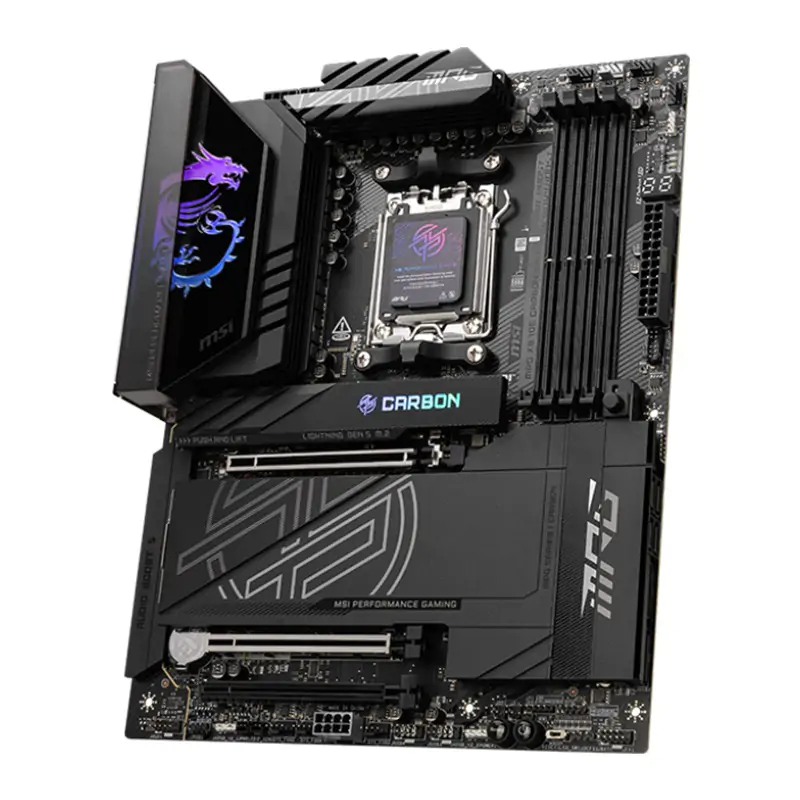 The MSI MPG X870E CARBON WIFI is a high-end ATX gaming and enthusiast motherboard built around the AMD X870E chipset and supporting AM5-socket Ryzen™ 9000, 8000, and 7000 Series processors. It combines flagship-class power delivery with extensive connectivity, including PCIe 5.0, USB4, Wi-Fi 7 wireless networking, and dual high-speed LAN (5 GbE + 2.5 GbE), making it ideal for next-generation gaming, content creation, and high-performance desktop builds.