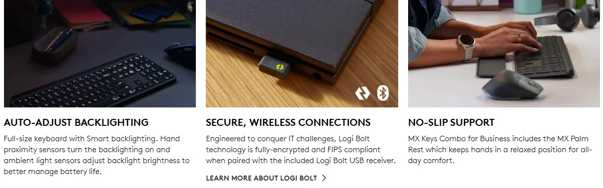 Logitech MX Keys for Business Combo includes MX Keys keyboard, MX Master 3S mouse, palm rest, and Logi Bolt receiver for secure wireless productivity. Features smart backlighting, Darkfield tracking, sustainable materials, and a 2-year warranty