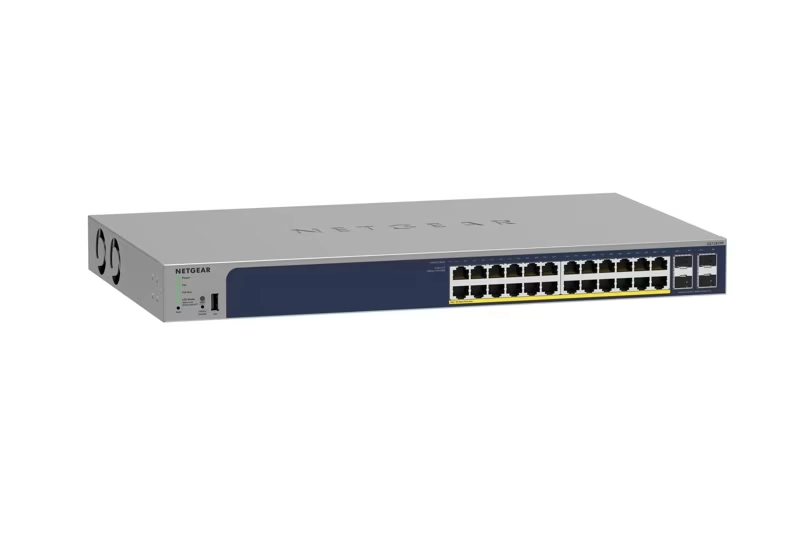 The NETGEAR 24-port Gigabit PoE+ Smart Managed Pro Switch designed for small to medium business networks, branch offices, and advanced home setups that require high-performance data and power delivery over Ethernet. It delivers 24 Gigabit PoE+ ports, allowing you to connect and power a wide range of PoE devices — such as IP cameras, VoIP phones, wireless access points, and other networked endpoints — without needing separate power supplies.
