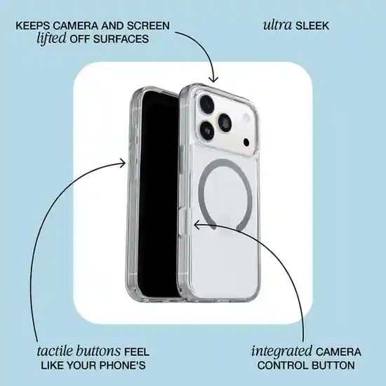 Symmetry Series clear iPhone case safely and securely shows off your phone. Ultra slim with a see-through finish, this clear MagSafe compatible iPhone case dials in your look while hugging your phone’s sleek shape and defending against hard drops. Every phone function works flawlessly, and the case features an integrated Camera Control button for seamless swiping, clicking and capturing. Built-in magnets snap securely to MagSafe chargers and accessories. The screen lip and raised edges around the camera provide an additional buffer for your camera and screen.