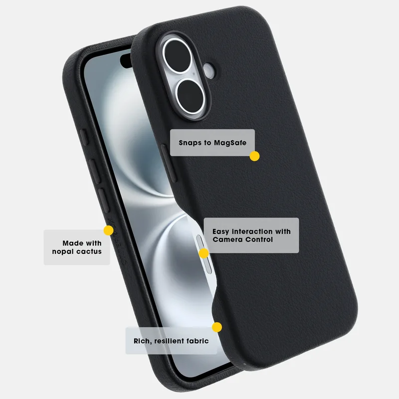 Meet the desert’s rarest bloom — cactus-based leather substitute by Desserto. It’s a plant-based alternative to animal leather that is organically grown and sustainably harvested from nopal cactus without the need for irrigation. So this iPhone 16 Plus Case doesn’t just look good. It’s also cruelty-free.