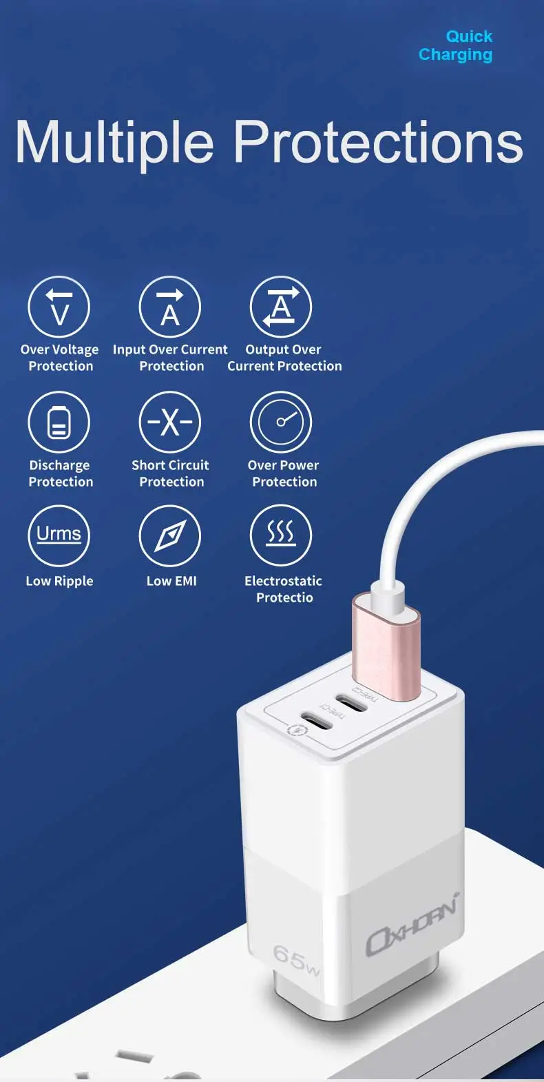 The Oxhorn 65W GaN Type-C Fast Charger is a high-efficiency, multi-port wall charger built with advanced GaN (Gallium Nitride) technology, allowing for greater power delivery in a compact, travel-friendly design.