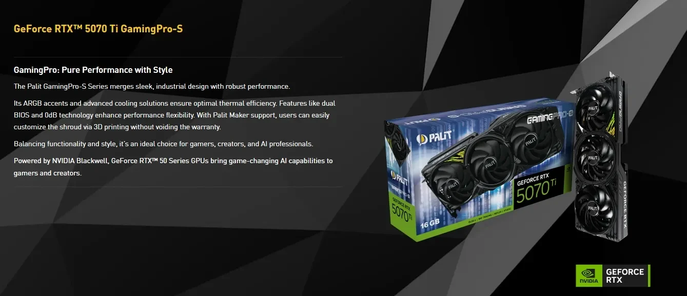 The Palit GeForce RTX 5070 Ti GamingPro‑S 16GB GDDR7 (model NE7507T019T2‑GB2031U) is a factory‑configured custom NVIDIA‑based graphics card built on the GeForce RTX 5070 Ti GPU from the RTX 50‑series. Designed for enthusiastic gamers, content creators, and users who demand excellent performance in 1440p and 4K gaming, this card combines high CUDA core counts, next‑gen architecture, advanced cooling, and rich connectivity options. It supports modern features including real‑time ray tracing, DLSS 4, AI acceleration, PCIe 5.0, and ultra‑high‑resolution displays — making it a future‑ready choice for premium PCs.