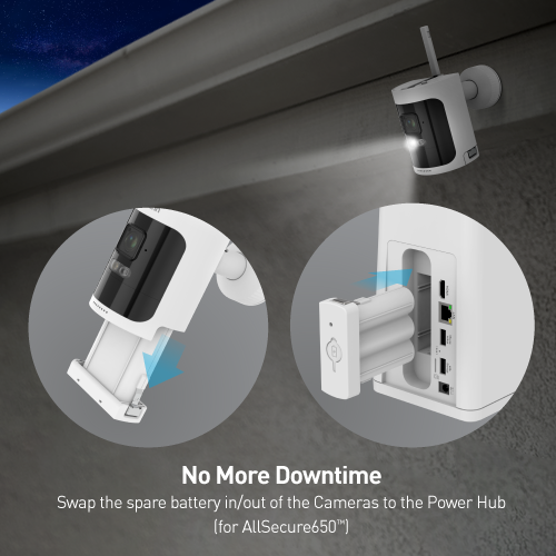 | AllSecure650™ Charging Charge this extra battery in the charging bay of the AllSecure650’s Power Hub. A full charge takes about 8 hours. | ![]() |