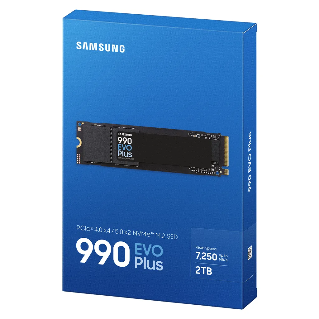 Samsung 990 EVO Plus 2TB NVMe SSD with PCIe 5.0/4.0 support offers up to 7,250MB/s speeds, efficient performance, and reliable storage for PCs and laptops, 5year warranty.