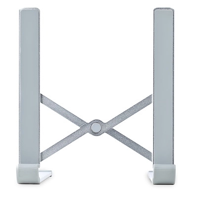 The elegant laptop riser features aluminum construction to ensure durability and sturdiness and a silver anodized finish complements the design. The support area facilitate passive cooling by reducing airflow restriction around the base of the mounted device. Non-skid rubber feet protect the work surface from scratches and scuffs, including glass top desks.