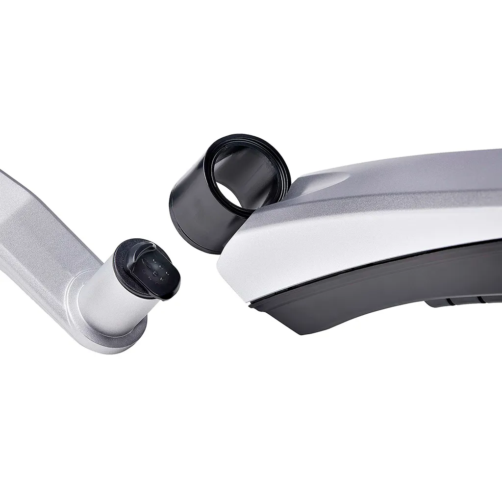 Full adjustability: spring-assisted arm allows height adjustment up to 270 mm (10.6″), arm extension up to 590 mm (23.2″), swivel ±180°, tilt range –15° to +90°, pan up to 240°, and 360° screen rotation — supports both landscape and portrait orientations.