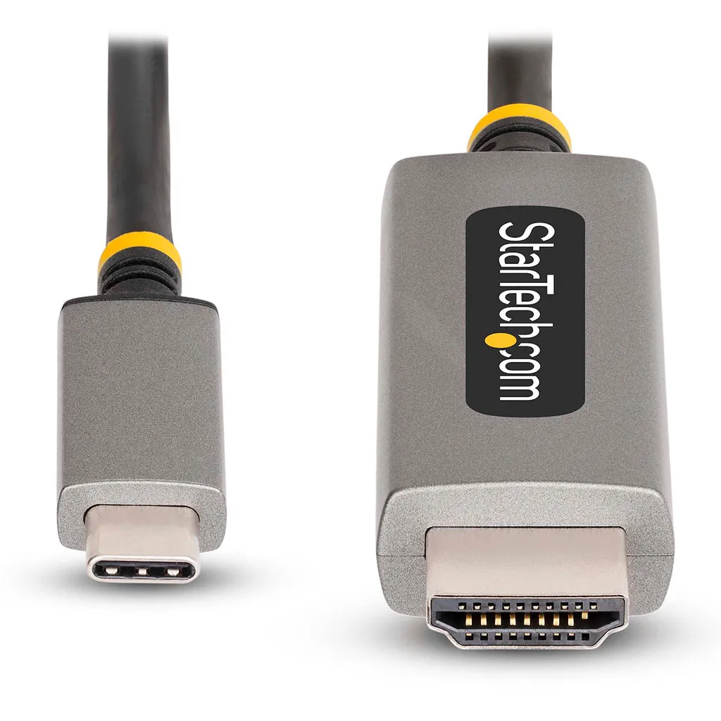 The StarTech 136B-USBC-HDMI213M is a USB-C to HDMI adapter cable that lets you connect a modern USB-C/USB4/Thunderbolt-equipped laptop, tablet, or PC directly to an HDMI display — TV, monitor, projector — without extra docking hardware. It supports cutting-edge video standards (HDMI 2.1 / DisplayPort-Alt Mode), enabling ultra-high resolution and refresh-rate outputs over a cable up to 3 meters long. This makes it ideal for home-cinema, creative work, gaming, presentations, or any scenario where you want crisp video + audio over a clean, single cable connection. The cable is plug-and-play, works across operating systems, and supports high-fidelity audio — so it’s ready out of the box.