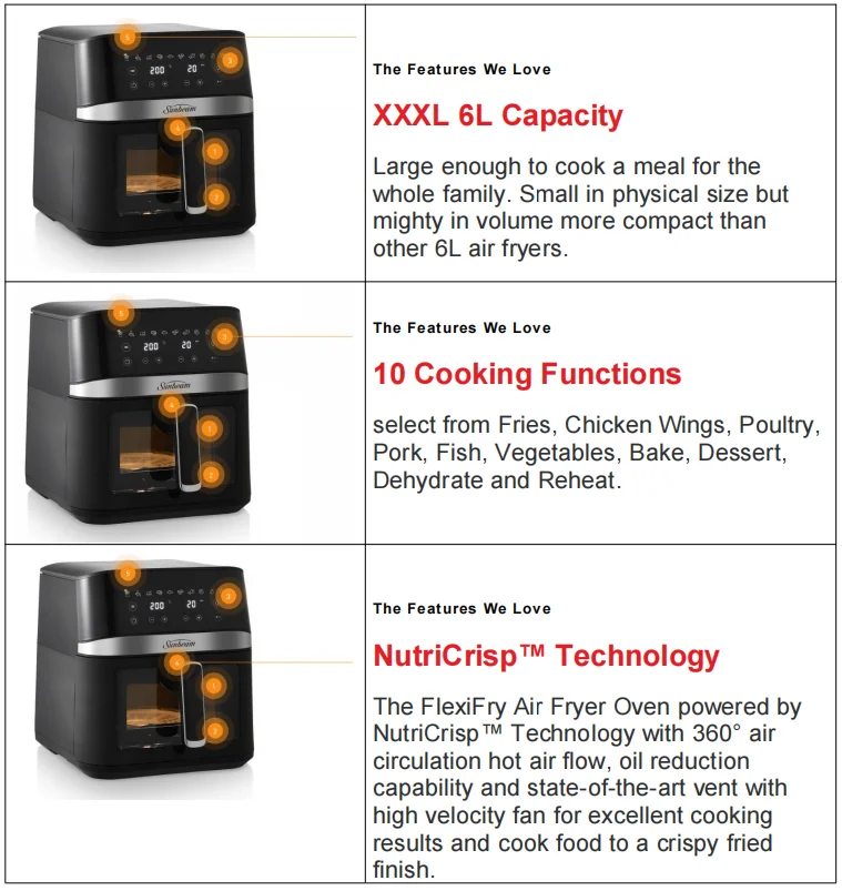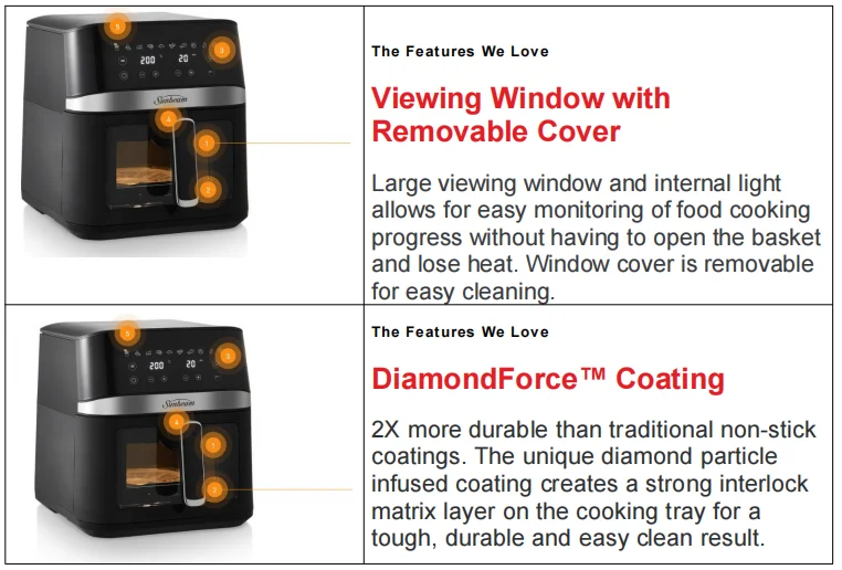 Sunbeam 6L Digital Diamondforce Air Fryer has a large viewing window & internal light. Non-stick DiamondForce coated tray. 6L Capacity, Compact Size. Nutricrisp Technology for Superior Performance. 10 Cooking Presets