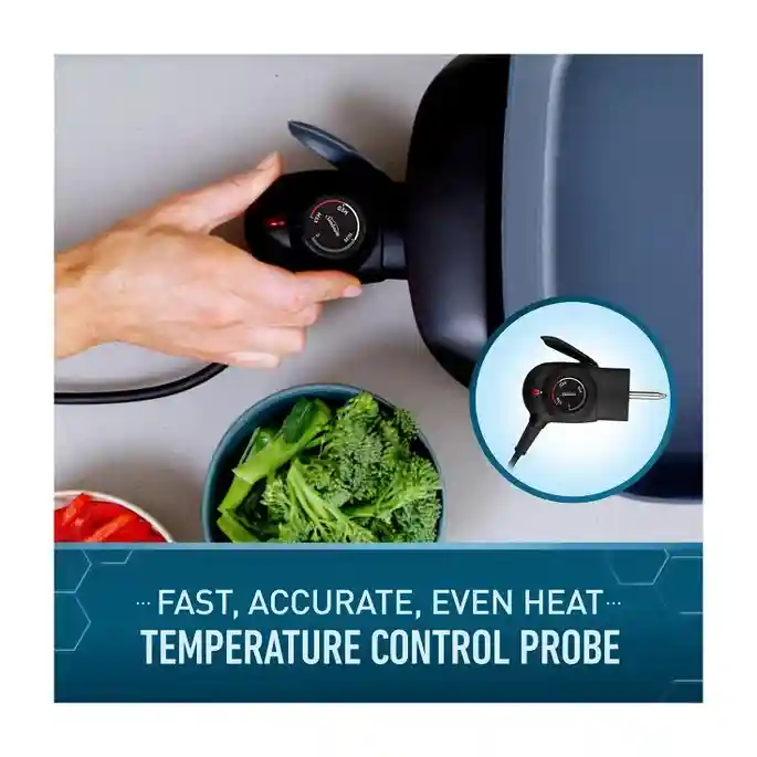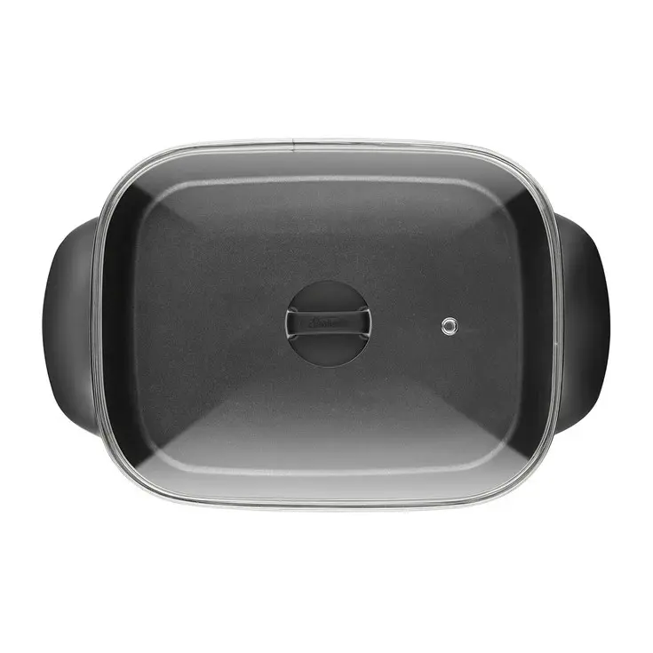 | Additional Features | Cast-in element; cool touch handles; pan tilt lever; glass lid; dishwasher safe pan; probe |