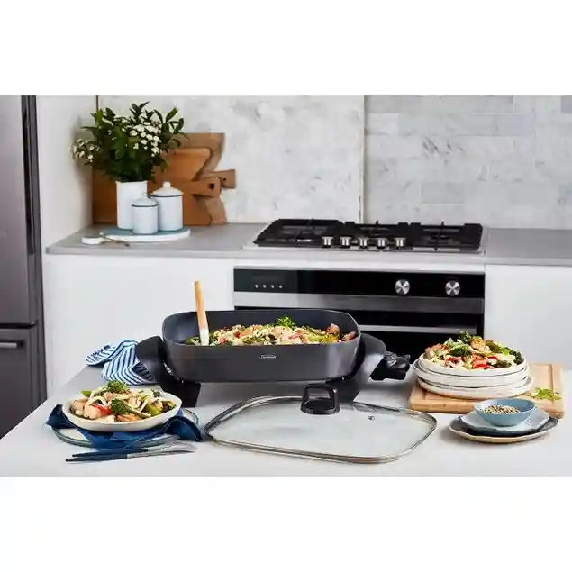 The DiamondForce™ Banquet Frypan is the perfect helper when you’re entertaining or cooking wholesome family meals. This unique electric cookware saves space on your kitchen benchtop when you’re cooking for a crowd. The versatile frypan allows you to control the temperature with a thermostat, ensuring your food is consistently cooked through or keeping your food warm while you’re busy entertaining. The deep cooking surface is great for family sized meals like casseroles, stews and soups. You can make minestrone, pumpkin soup or comforting lamb shank dishes effortlessly. What’s more, you can roast, braise, sear or reheat. With the tilt and base lever you can baste your food hands-free.