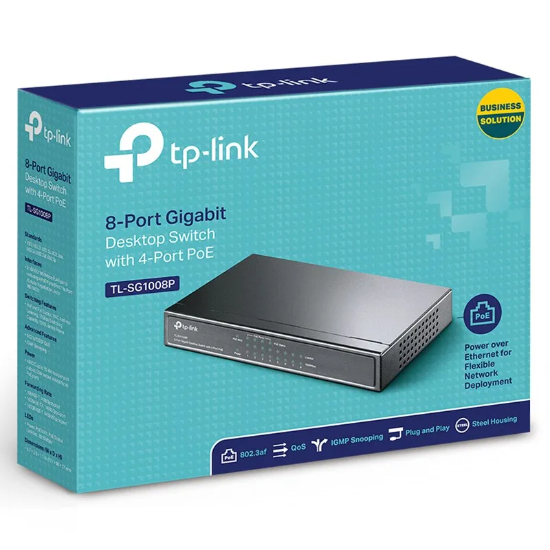 TP‑Link 8‑Port Gigabit PoE+ Switch with 4 PoE+ ports and 64 W power budget — plug‑and‑play unmanaged networking with QoS and IGMP Snooping for cameras, access points, and VoIP devices, 5year warranty.