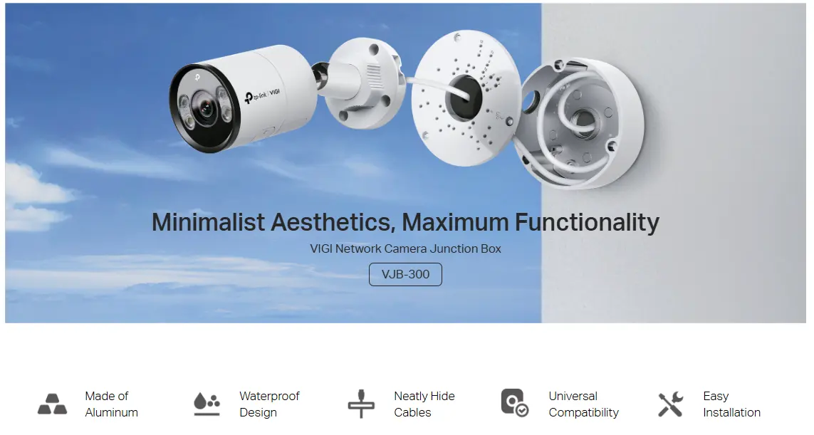 TP-Link VJB-300 VIGI Network Camera Junction Box, designed to effortlessly conceal cables while providing robust protection. Crafted from durable aluminum with waterproof capabilities.