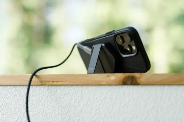 Experience quick and hassle-free magnetic charging with the UAG wireless charging pad. Integrated magnets that align perfectly to deliver charging speeds up to 15 Watts. With MagSafe™ case compatibility you can conveniently charge your device without removing your protective case. The integrated metal kickstand allows for hands-free viewing while your device powers up so you can catch up on your favorite shows or keep an eye on notifications. Crafted for durability, the rugged construction features a metal alloy housing, a lightweight carbon fiber inlay, and a high-strength braided cable. Power up with ease with the UAG wireless charging pad.