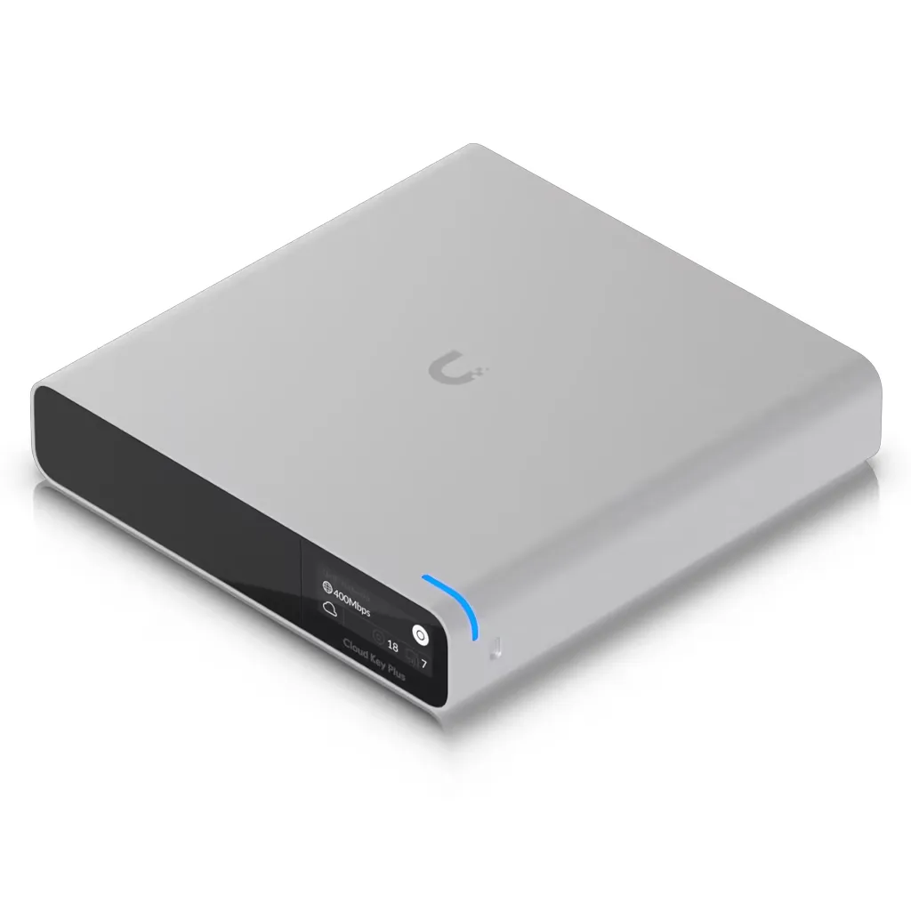 The UniFi CloudKey+ is a compact UniFi Console that connects directly to the Site Manager at unifi.ui.com, providing powerful, multi-application site management. It hosts the full UniFi application suite, including Network, Protect, Access, and Talk, enabling centralised control over your UniFi deployment.